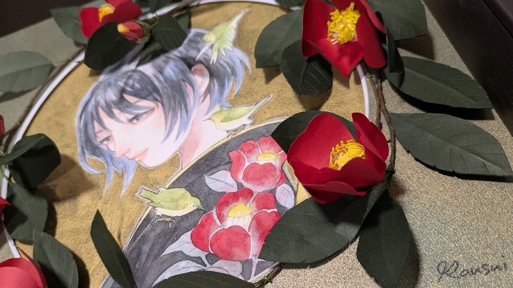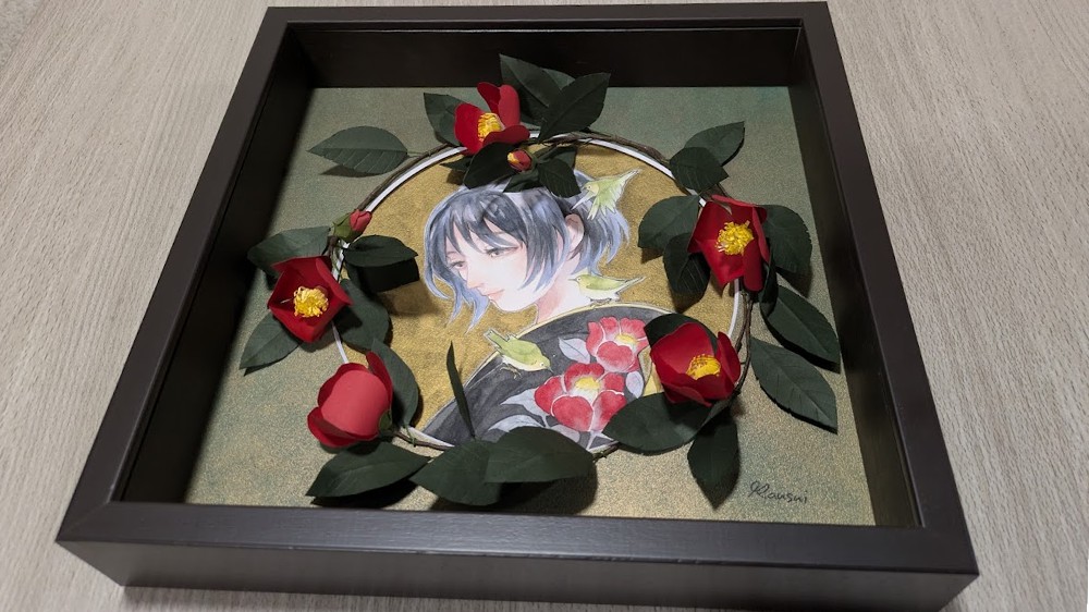 透明水彩で描いた絵の上に、円形に抜いたマットを重ね、立体の切り紙の椿は針金でしっかりと固定しています。花自体はほとんど動きませんが、見る位置やライティングによって、立体の椿が絵に落とす影の表情が変わり、作品の印象がうつろいます。