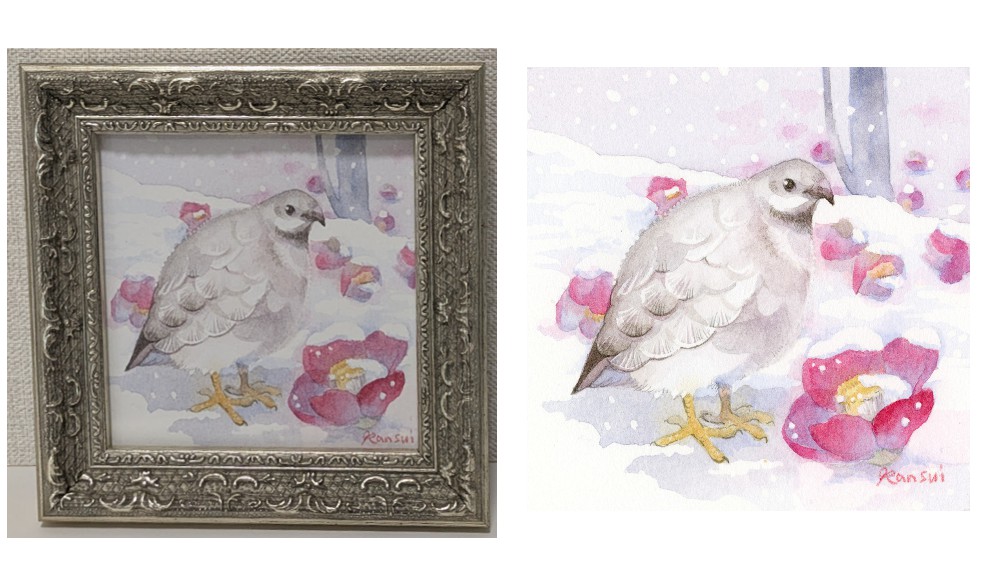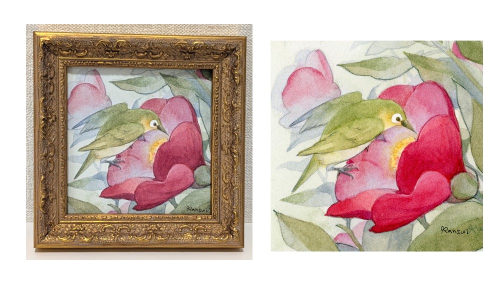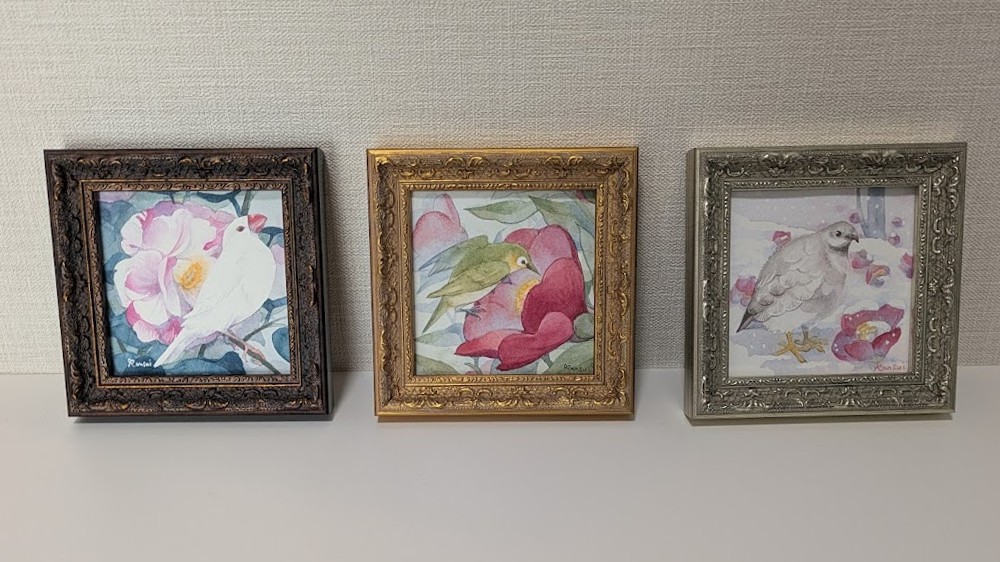 小作品3点は椿に寄り添う小鳥を描きました。おなじ「あい」という音に、それぞれの関係性にあう漢字をあてはめました。