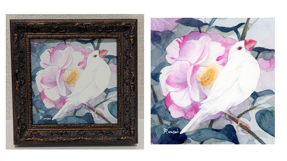 白文鳥と椿。白文鳥と椿。どちらも人の手によって選ばれ、磨かれてきた、美しい姿。愛されることそのものを受け入れ、咲き誇る存在として描いています。