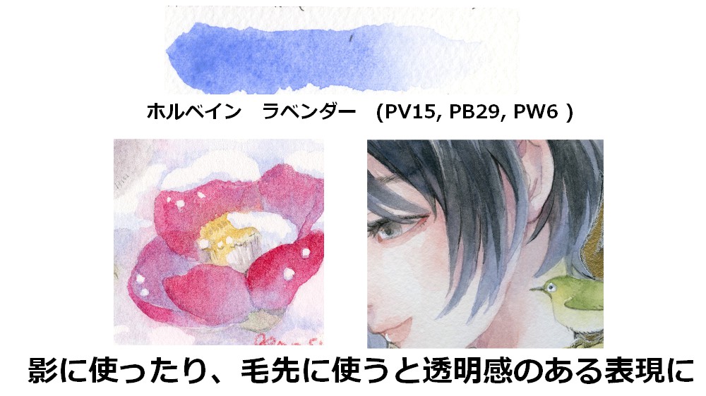 今回はどの絵にもホルベインのラベンダーを乱用しましました。影や毛先に使うと透明感がでていいですね。青色として混色しても、冷たくなりすぎず可愛らしい優しさのある表現ができますね。優しい冬の絵にピッタリです。